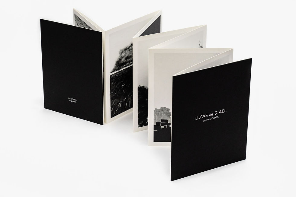 Livre-objet réunissant une série de monotypes en noir et blanc, réalisés par l’artiste Lucas de Staël sur une presse de taille douce datant des années 1950 dans son atelier à Ménerbes.
